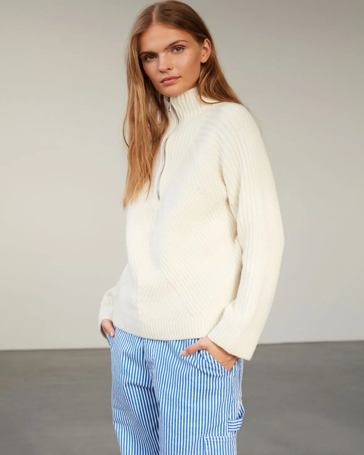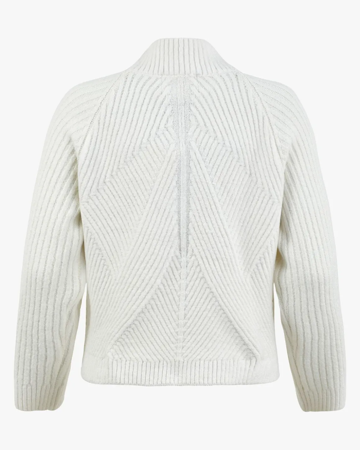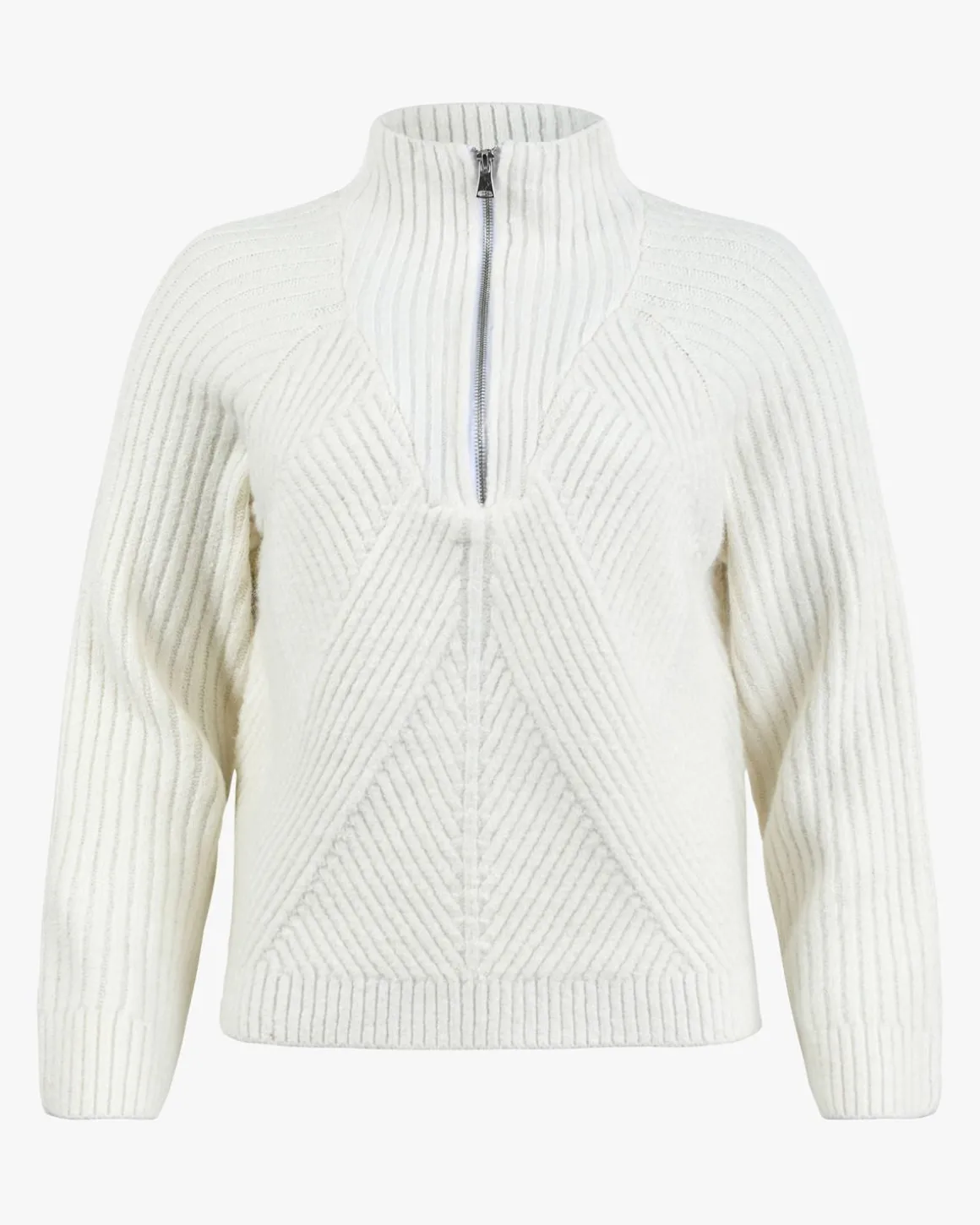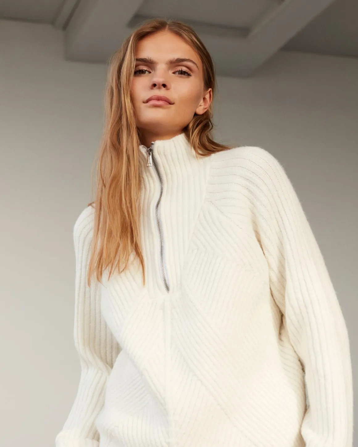 The knit sweater with long sleeves and a high neck gives you warmth and comfort, while the zip front adds a modern touch and makes it easy to style. This sweater is the perfect choice to keep you warm and fashionable in any situation.