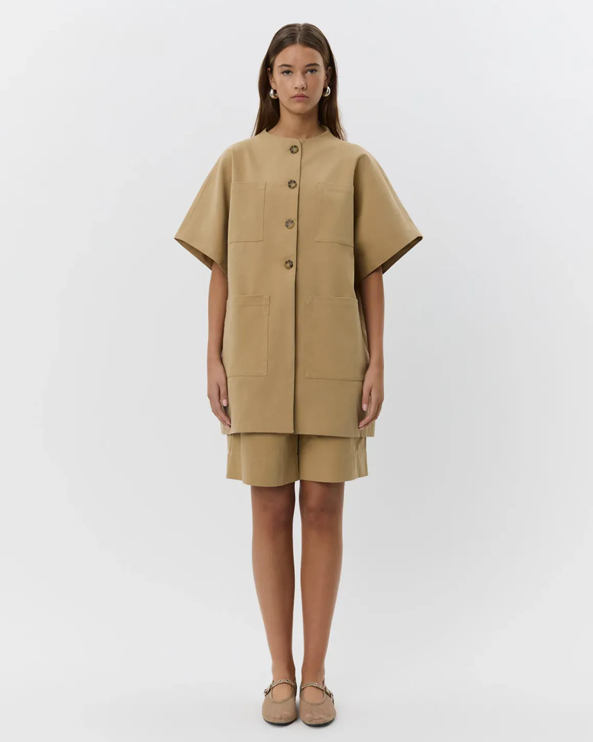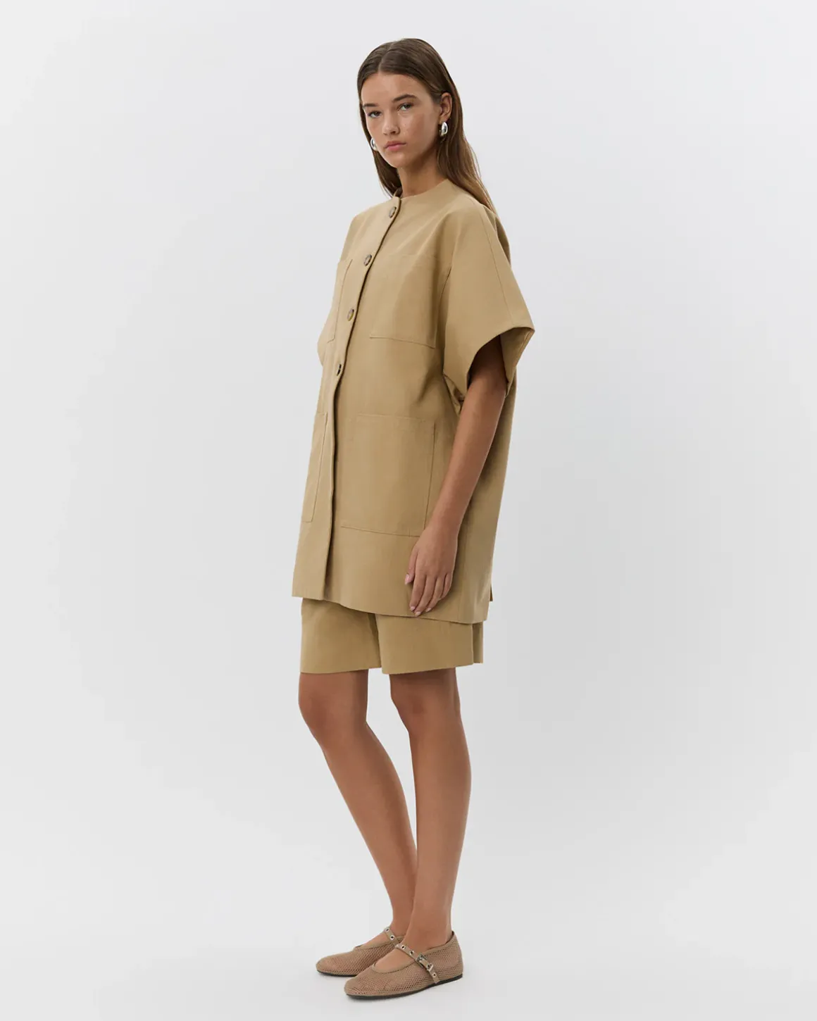 • Button closure at the front and four pockets