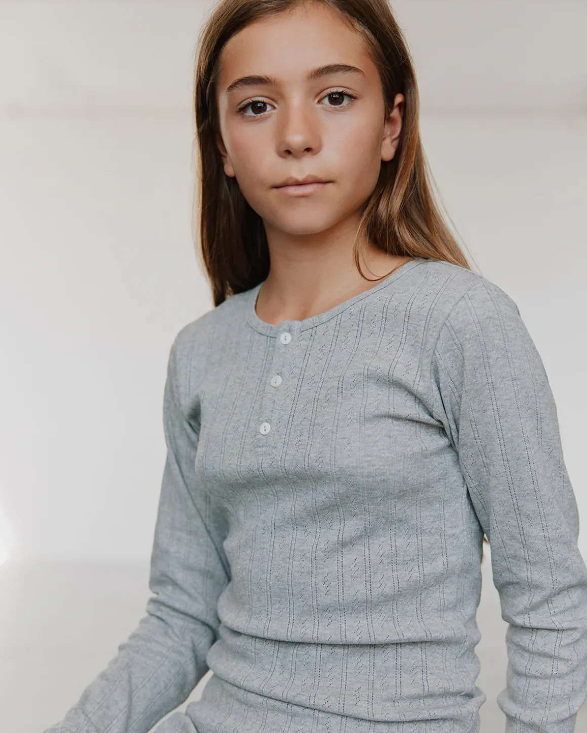 • Round neck with button closure.