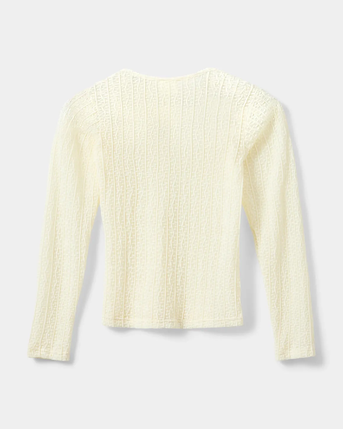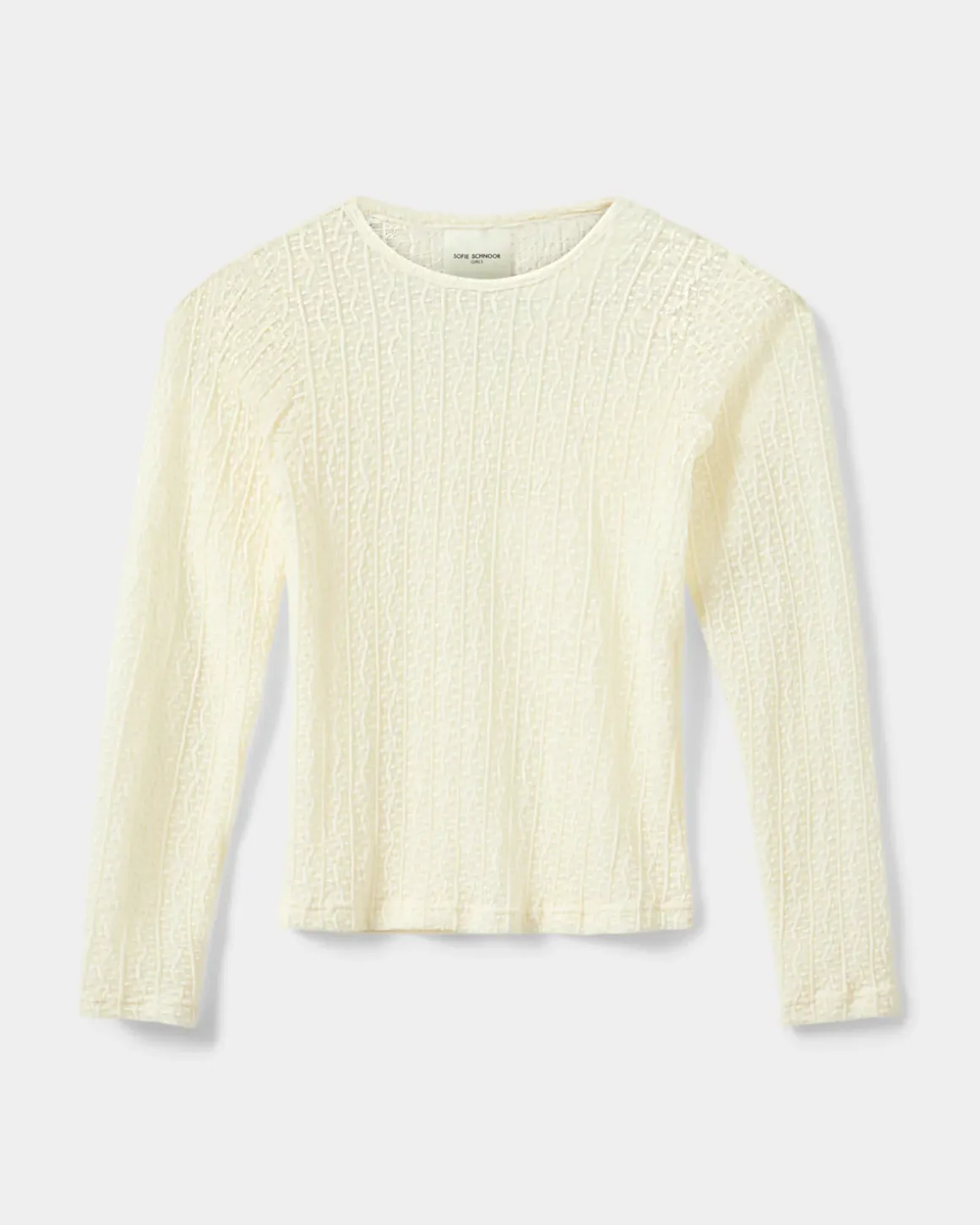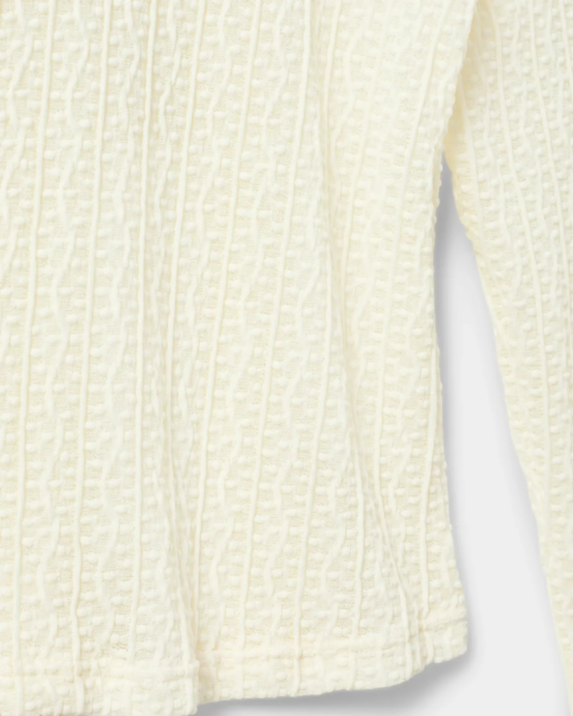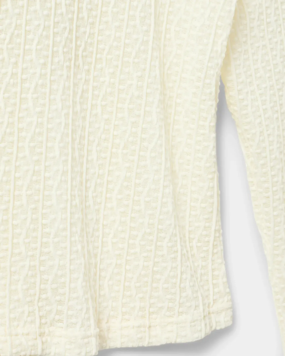 Long-sleeved T-shirt in cream-colored structured fabric. The T-shirt has a round neckline and a close-fitting silhouette. Made from an elastic polyester blend.