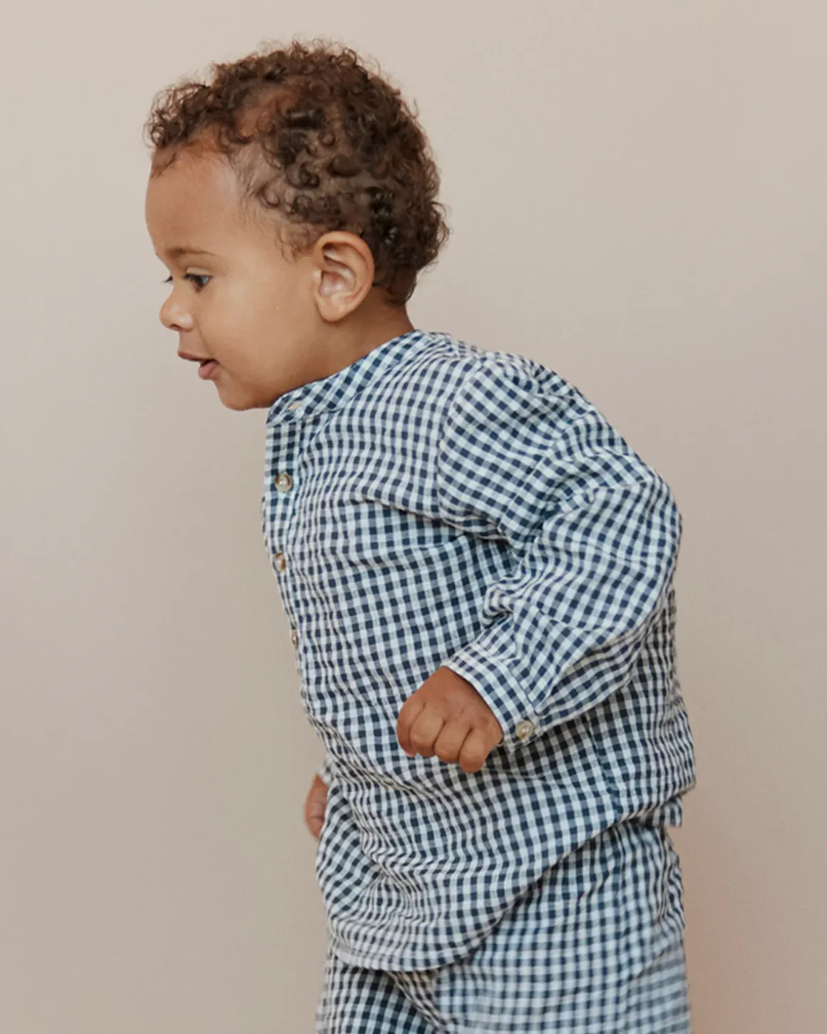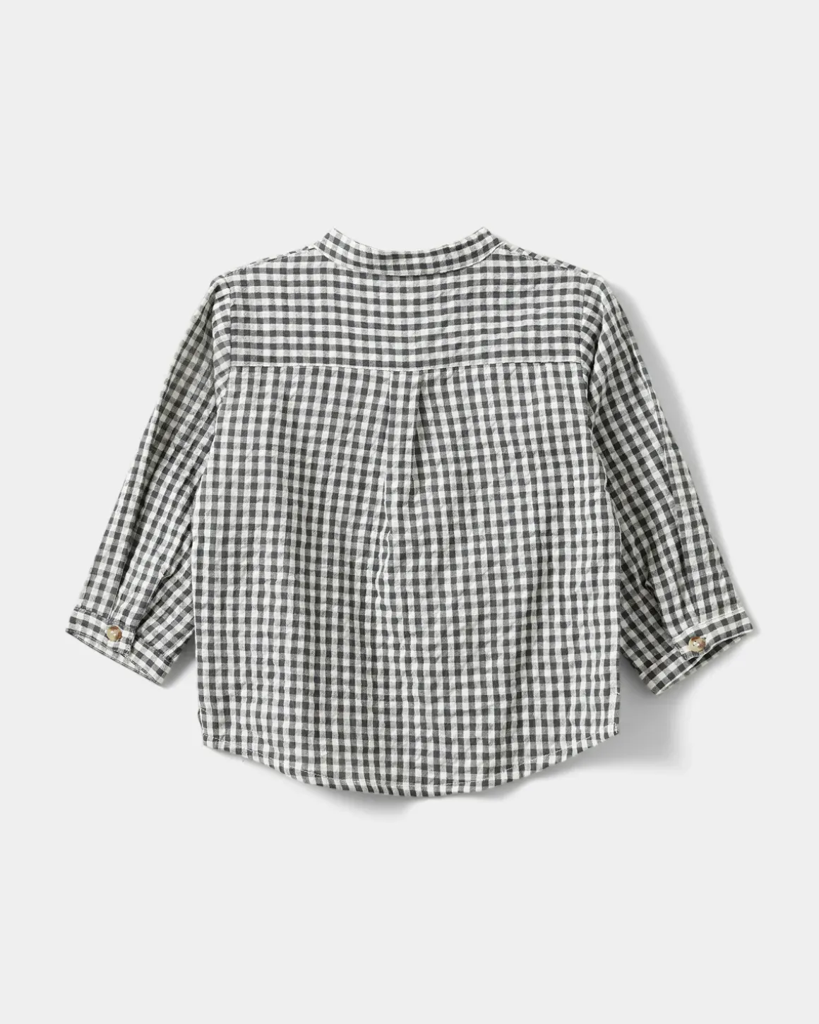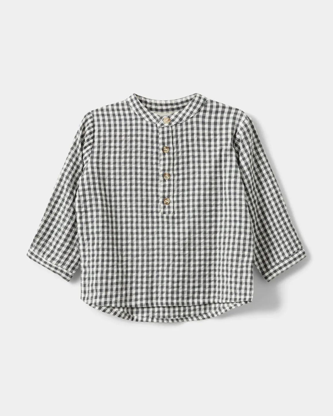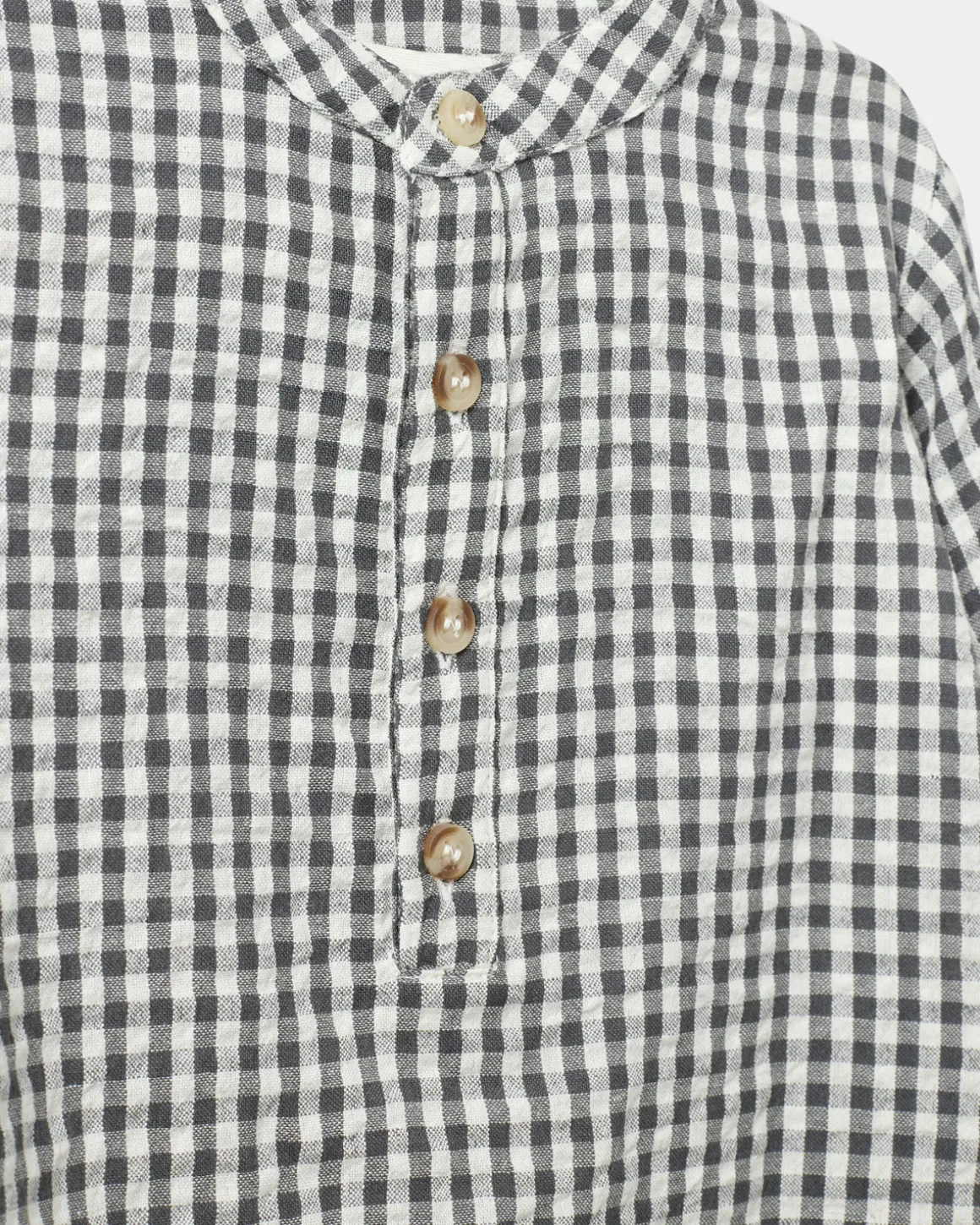 Cute shirt with black and white checks. The shirt has a mandarin collar, long sleeves, and a button closure in the front. Made of 100% cotton.