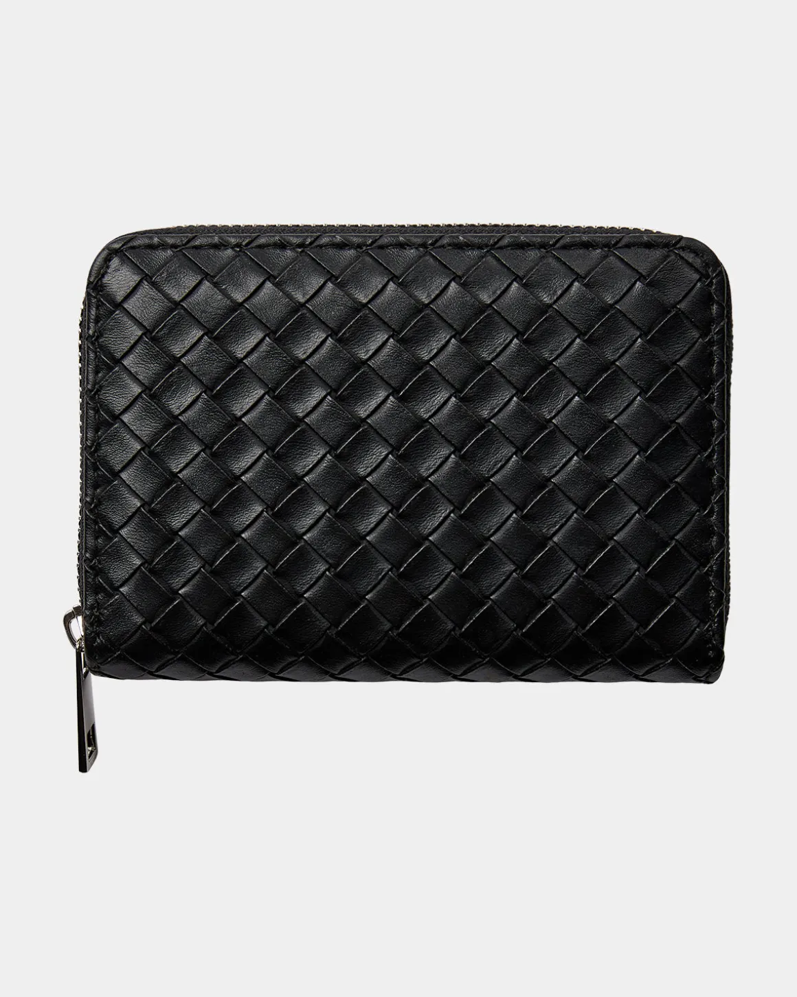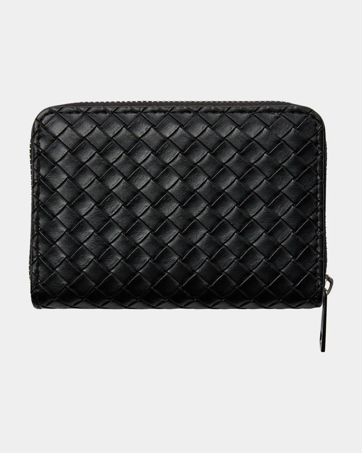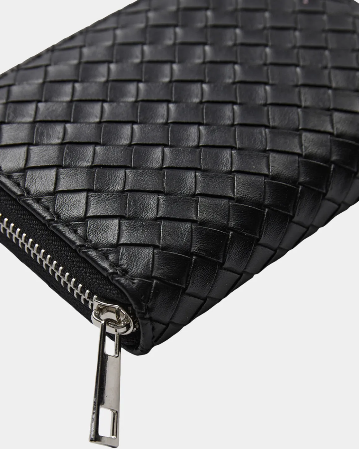 Black wallet in woven faux leather with zipper closure.