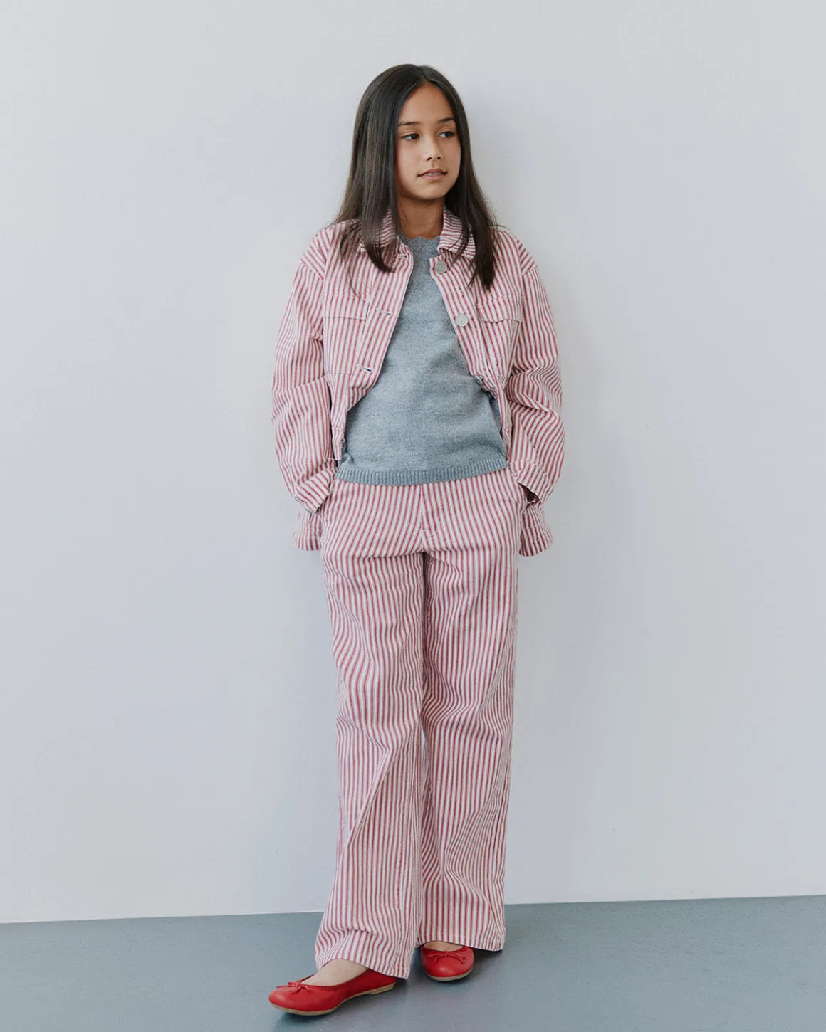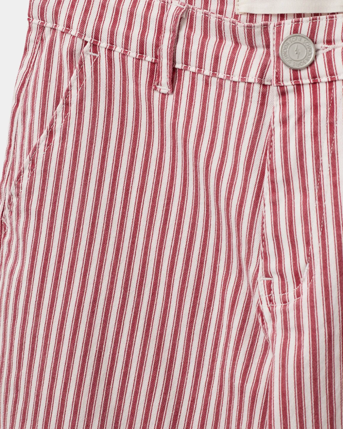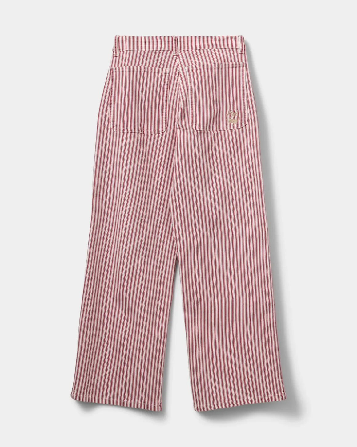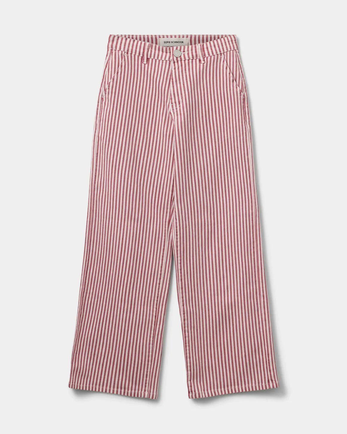 Loose fit jeans with red and white horizontal stripes. The pants have a zip and button closure and a small ”cherry” logo on the right back pocket. Made in a luxurious cotton blend.