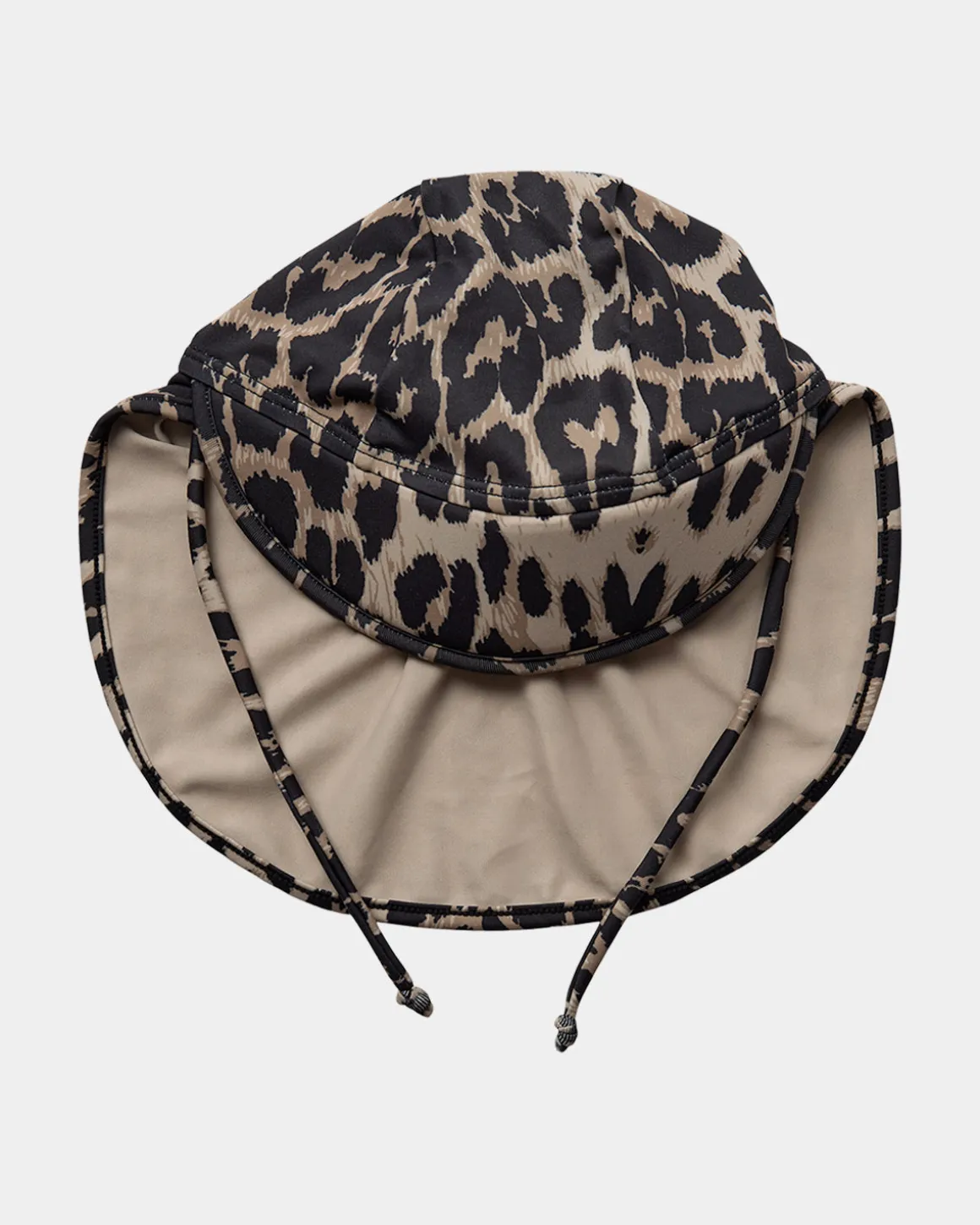 Sun hat with leopard print and shade for sun protection. The hat has a drawstring under the chin for a secure fit. Made from a recycled polyester blend of 82% recycled polyester and 18% spandex for a stretchy and lightweight material.
