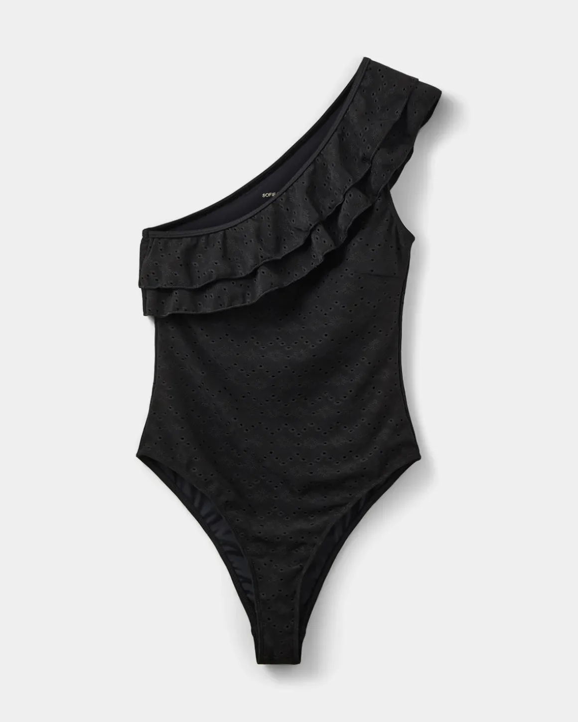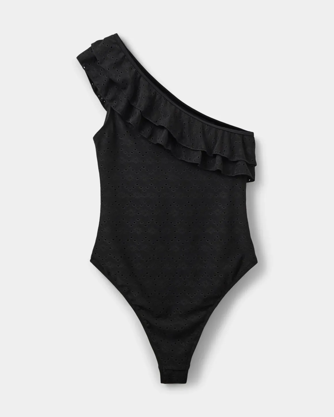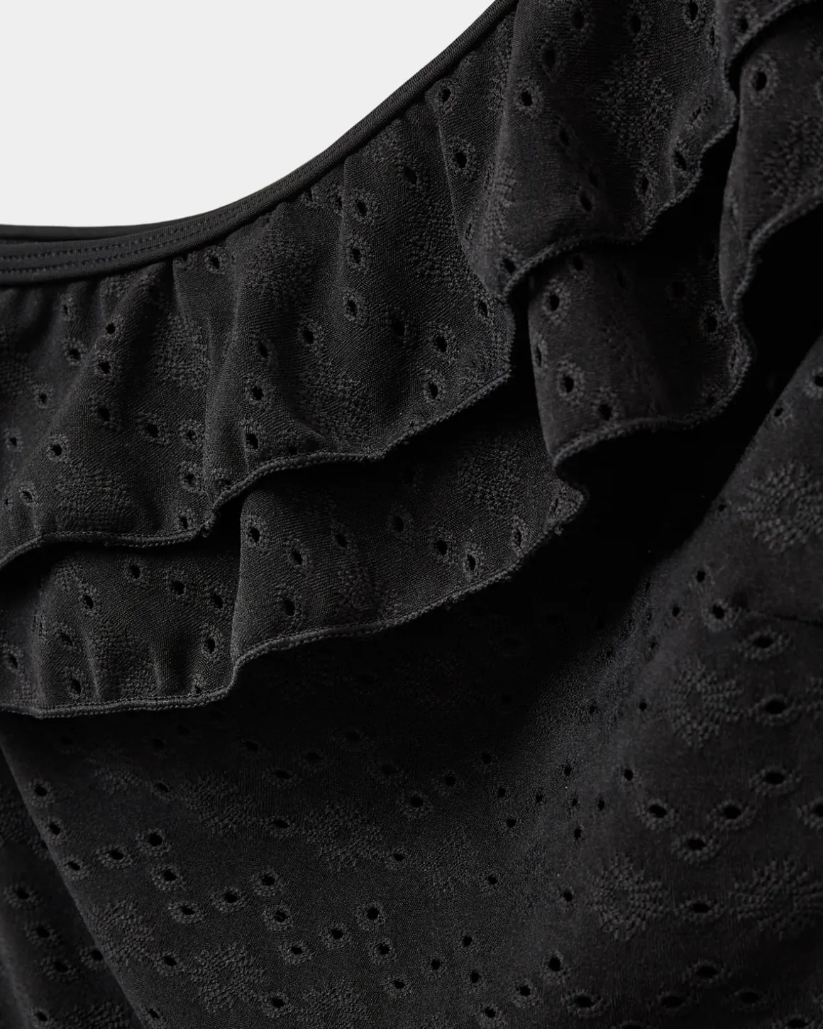 • Asymmetrical cut with wide ruffle edge over one shoulder