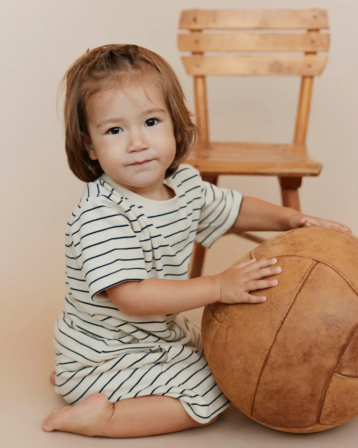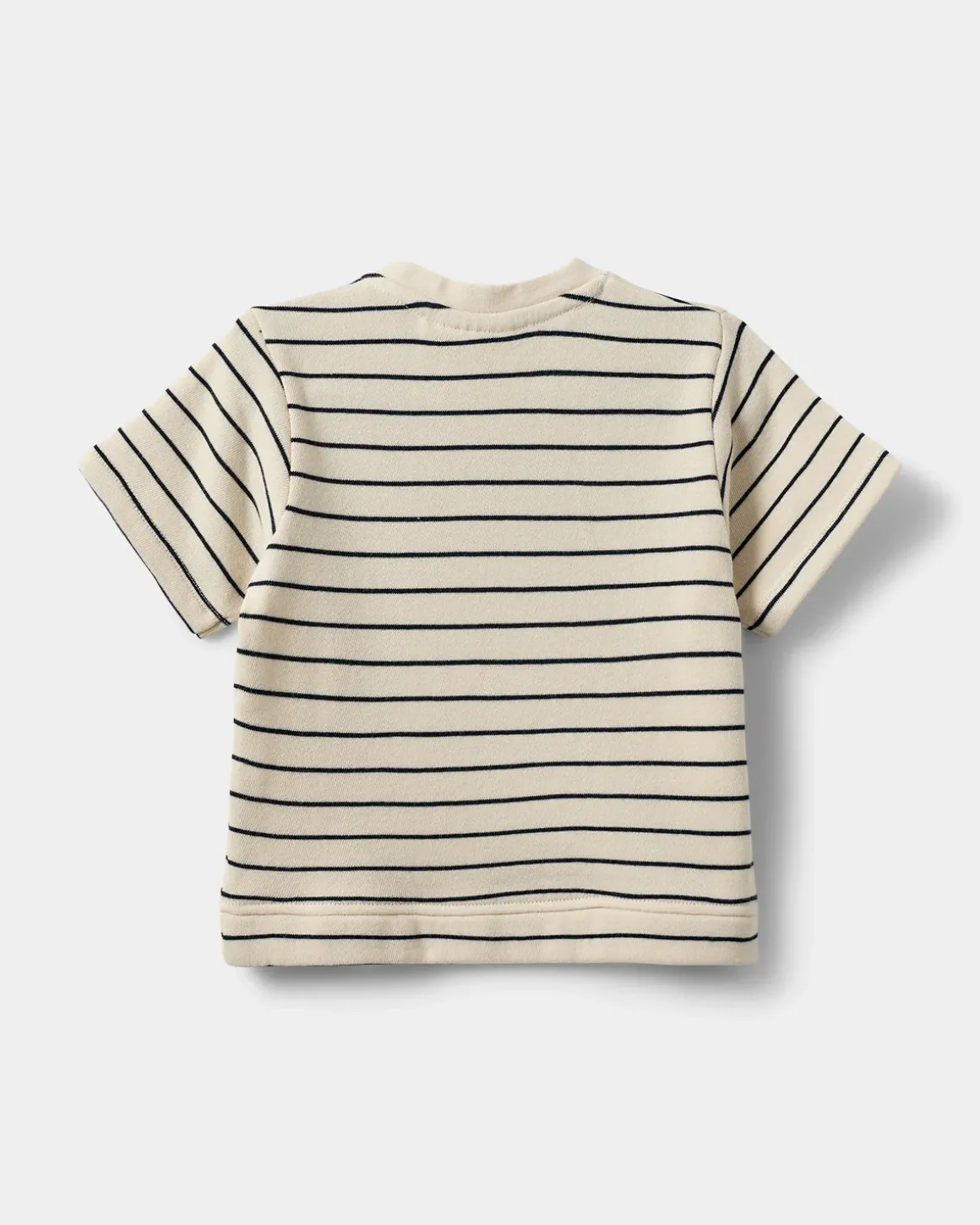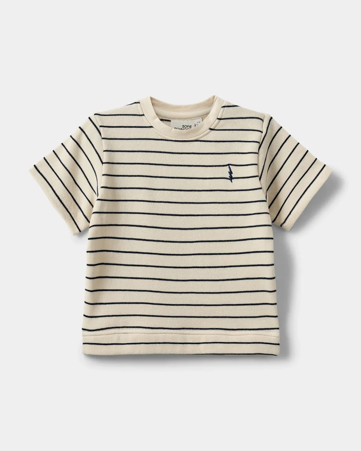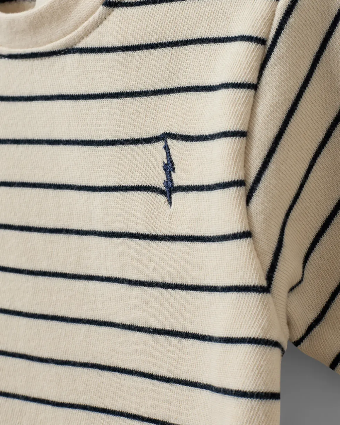 • T-shirt with stripes, round neck, short sleeves, and a small embroidered lightning bolt on the chest