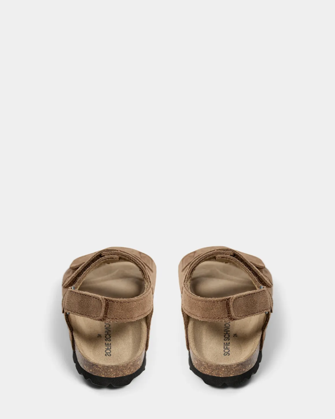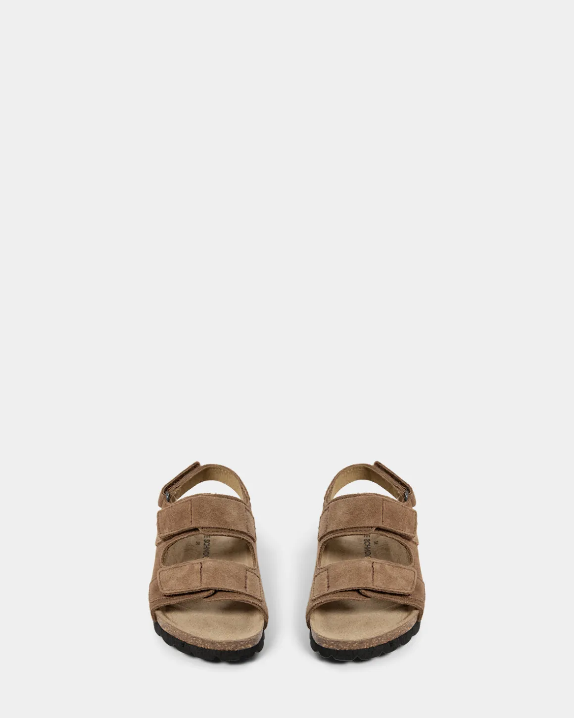 Sandals in the color tan with suede and adjustable Velcro closures. The sandals have an ergonomic cork sole and a non-slip rubber outsole. Made of 100% suede, 100% leather, and 100% rubber.
