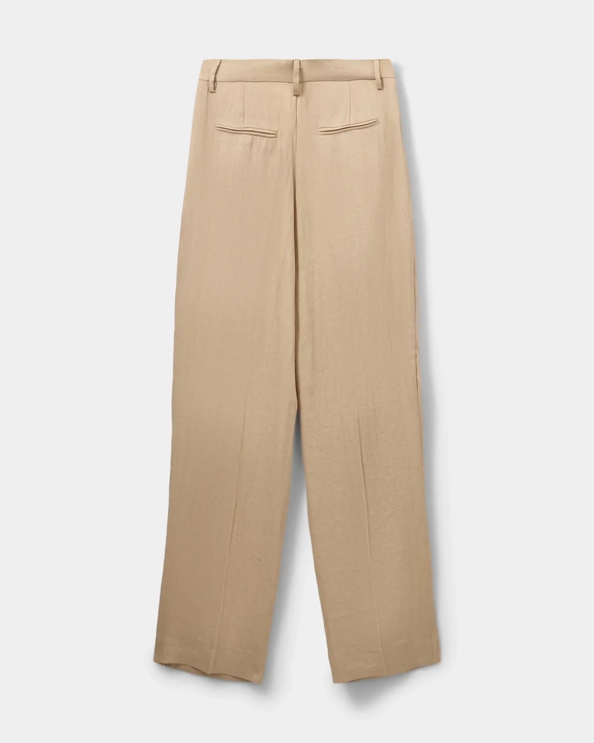 • Wide legs, creases, side pockets and welt back pockets