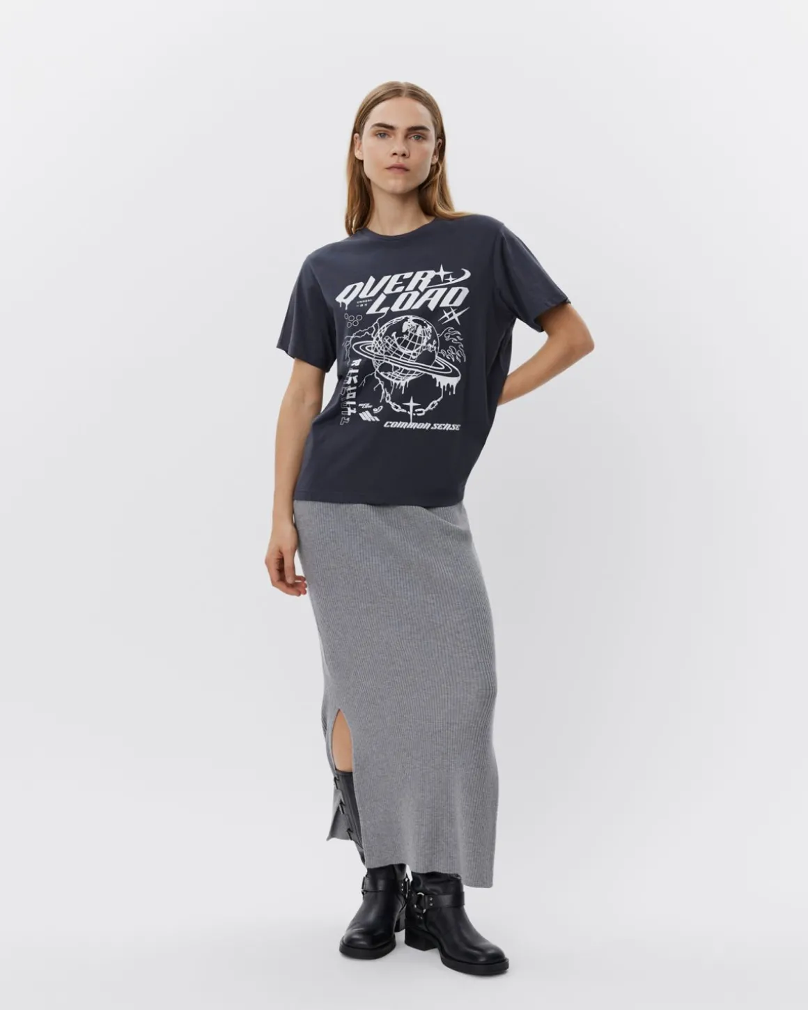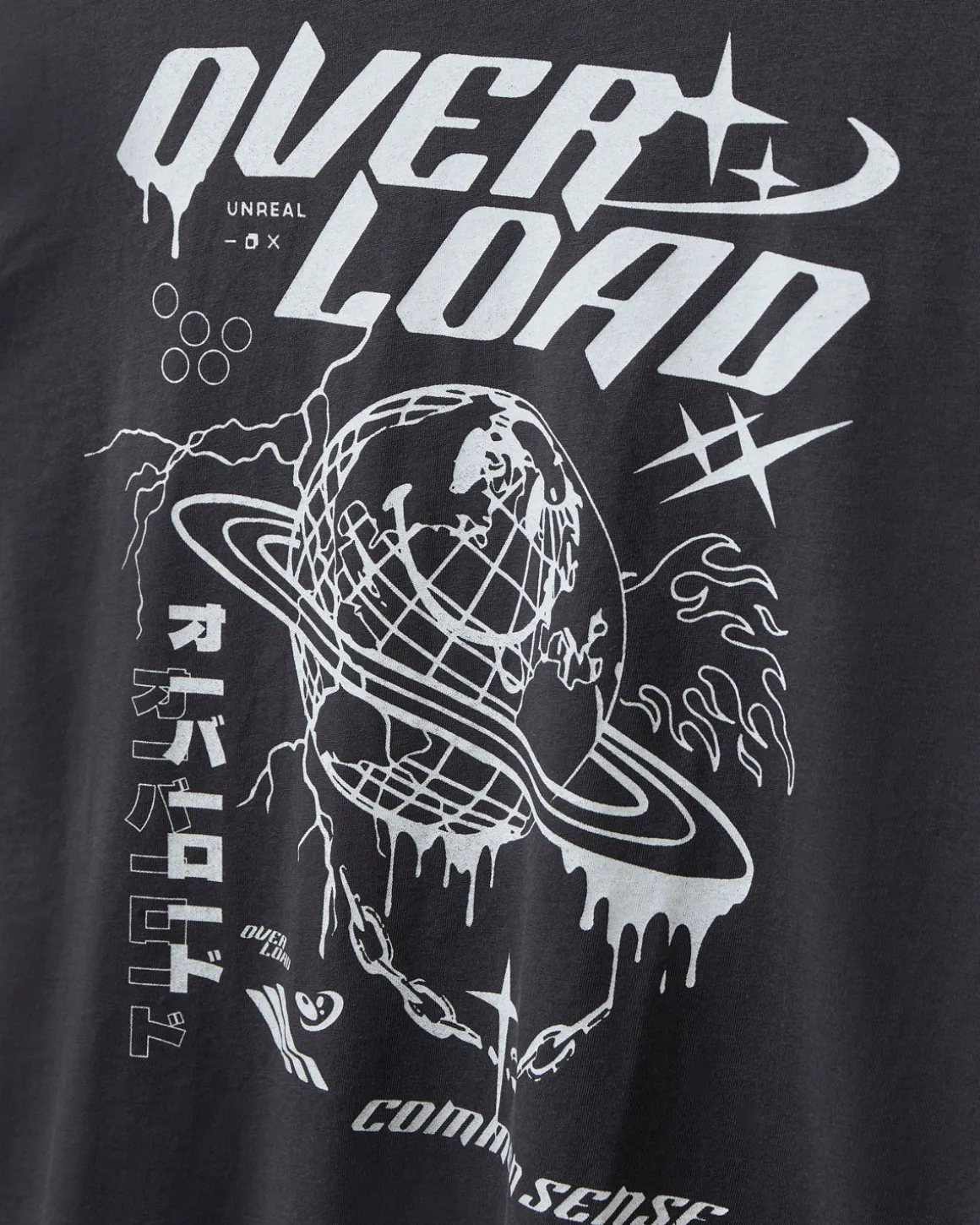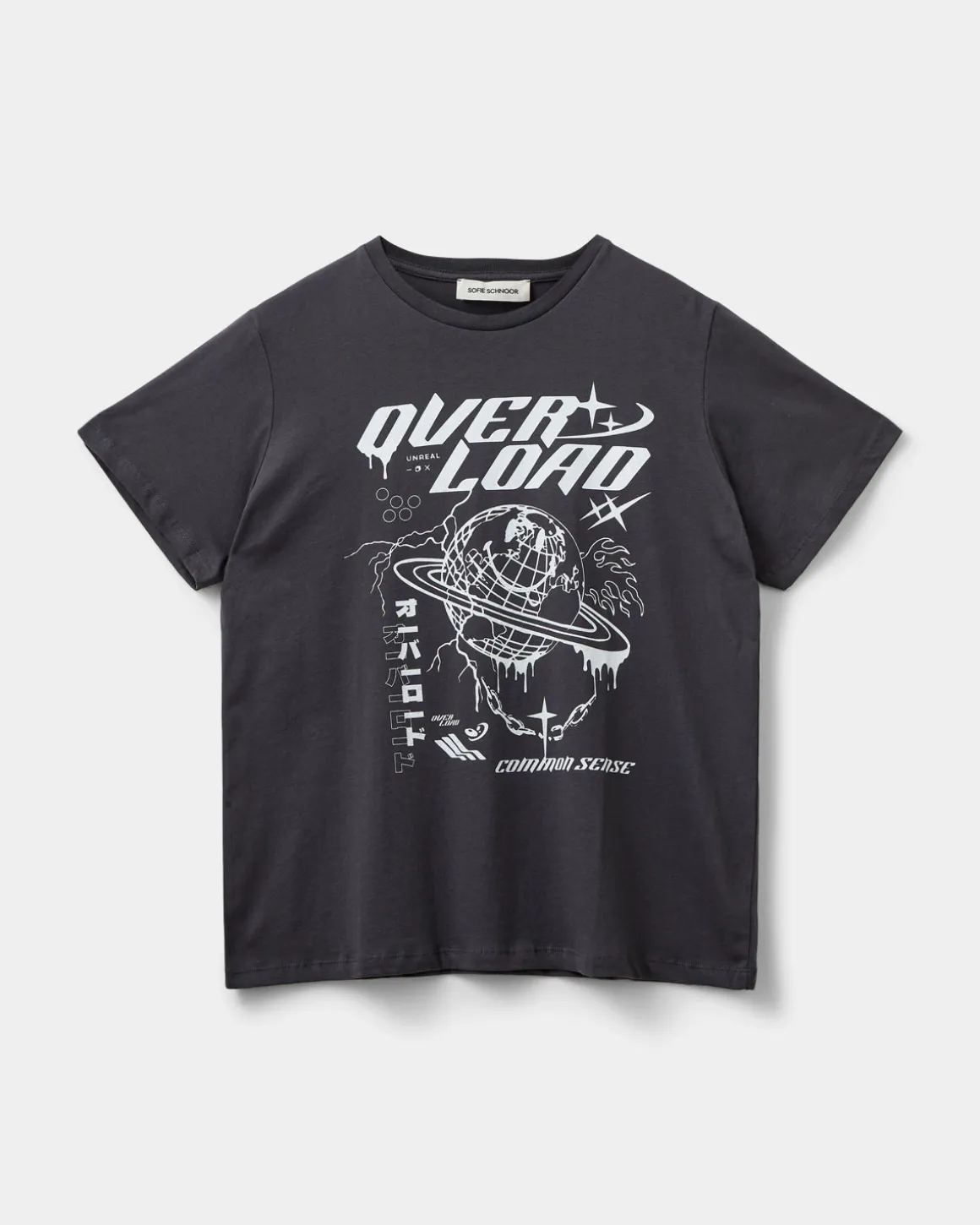 The design is adorned with a print of a planet and the text ”OVERLOAD” in blue.