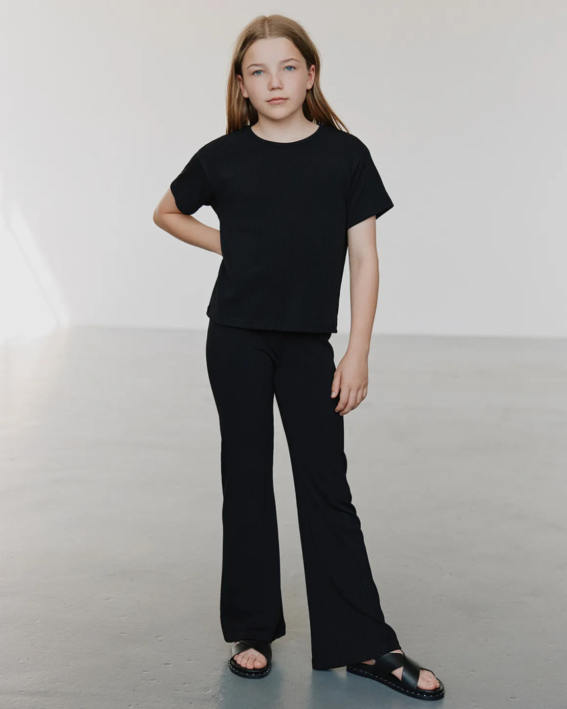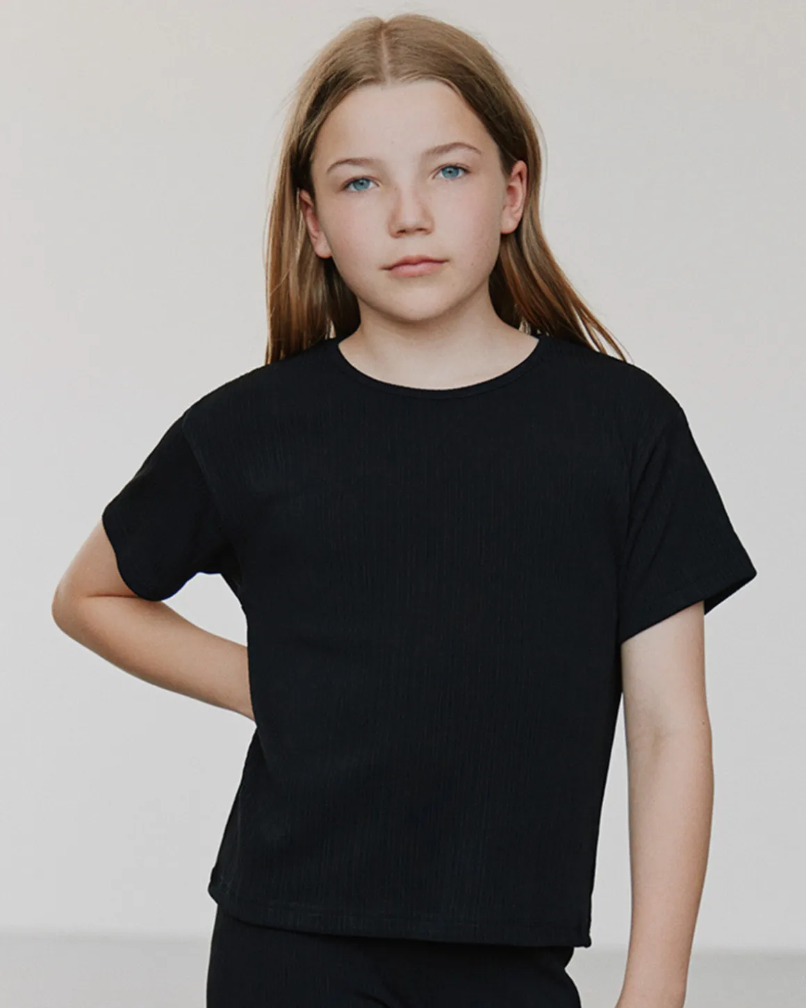 Stretchy black T-shirt with rib knit fabric and round neckline.