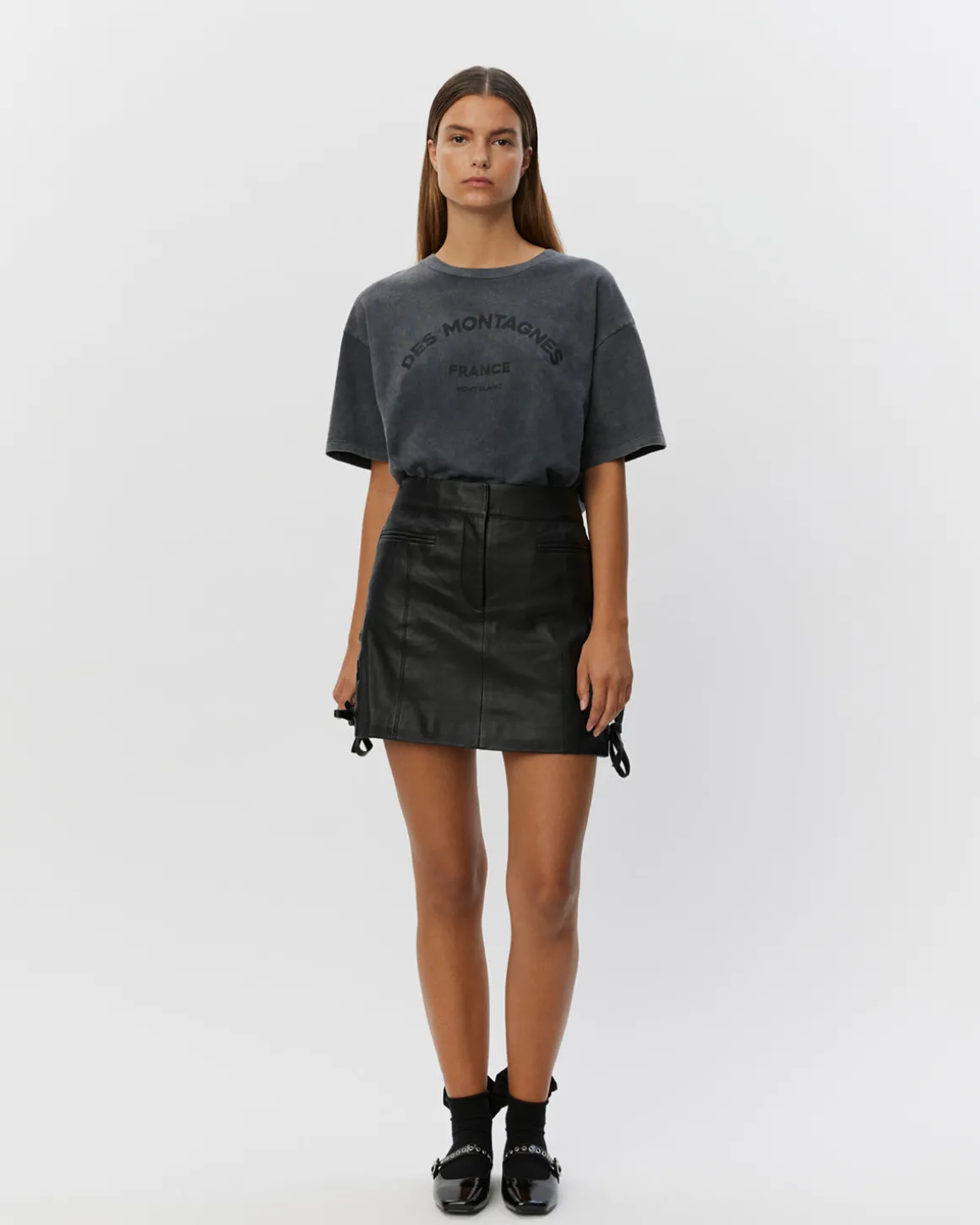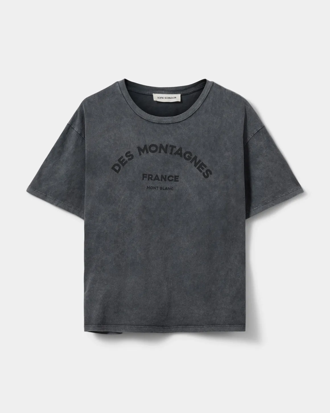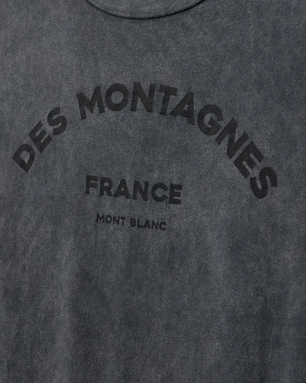 • The T-shirt is designed with the text ”DES MONTAGES,” which adds a graphic element to the simple design. This text print creates an eye-catching focus that at the same time maintains a minimalist expression.